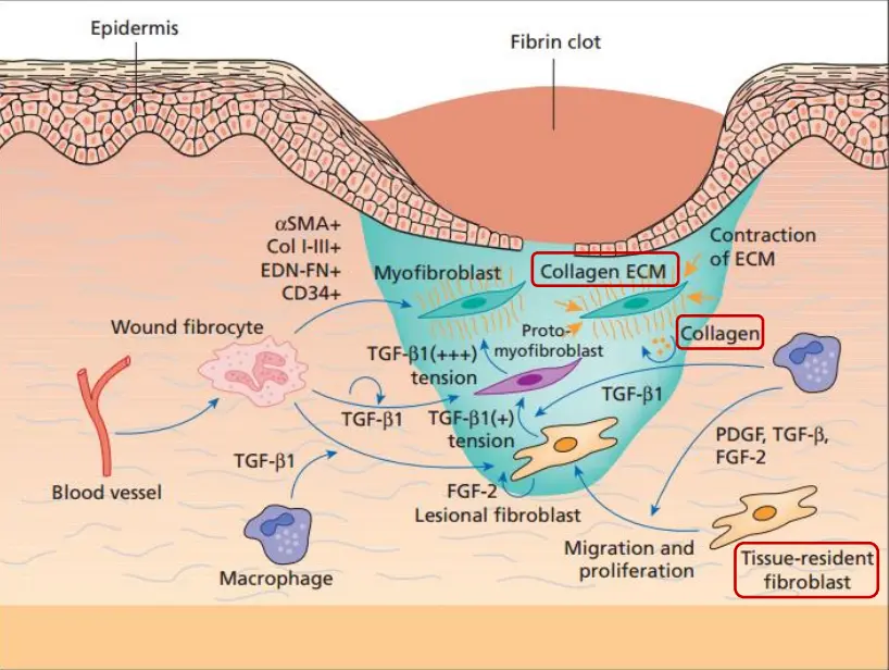 当条件适宜时,丝聚蛋白在半胱天冬酶等酶的作用下水解为游离氨基酸,构成天然保湿因子NMF中的氨基酸成分。皮肤修复损伤的机理图左:损伤较轻,仅涉及表皮,修复以再生为主;